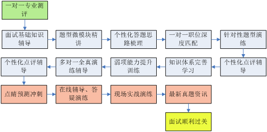 入學測評、理論講授、案例分析、實戰演練、診斷總結、個性點評、預測沖刺、全程輔導,八大環節貫穿面試輔導課程,緊密銜接,整體聯動,確保培訓有效性。